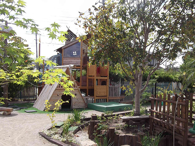 この園庭の特徴は築山を中心とした、たくさんの植物がある自然遊びの場やサクラとフジの咲く癒しのデッキ、子ども達の挑戦の場となる遊具です。フジの花の香りが漂うデッキはグリーンの日よけが心地良く、みんなでお弁当を広げる光景が見られます。もちもちの木の枝を足掛かりに登れば、てっぺんには達成者だけが鳴らせるマリーンベルが!複雑な階層をもつ遊具が子ども達の挑戦を待っています。